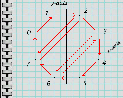 1st face will use vertex points 0,1,2,7 For more details on this and other possible face definition combinations, please click here. With this information, we are ready to define the faces that will form our octagon. Goto Faces>Add. Enter the values, set the face type, and click OK. Repeat this for each face. You can watch the shape develop as you add faces.
