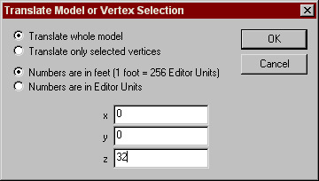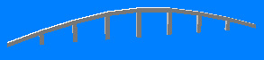 Insert the saved model and repeat this step until you have 8 sections of equal length. Center the model when you finish and save it. This is important! Open up the resize dialog and turn on Keep Proportions. Change the height to 2 feet, and click OK. In the Vertex menu, click Merge close vertices and click OK. Resize the model back to it's original size (4 feet high, 4 feet long, 256 feet long) and delete all unused vertices (Vertex menu). We resized for reasons I will explain later. The next step is to create the curve of the bridge. Select all vertices and, using the TAB key to cycle through the vertices, deselect the very outermost vertices. Translate the selected vertices 10 feet up the Y axis. Deselect the outermost vertices you just moved and repeat, but go up 8 feet. Repeat but moving down to 6 and for the center section, 2 feet. Save the model, and allow the Y axis to be centered. Next, open cube.bin again, and resize it to 4 feet long, 4 feet wide, and 30 feet tall. Delete the top and bottom faces and Save it as upright section.bin Translate it 32 feet along the z axis and insert the model you just saved. Repeat until you have 7 sections. Save the 7-sectioned upright again, allowing the Y axis to be centered. Insert the curve section onto the uprights. It'll look ugly for now, but that's just temporary. Select all the vertices on the TOP of the uprights and translate down 2 feet. Deselect the innermost selected upright and continue moving them down, deselecting as each one is aligned. Congratulations, you now have a bridge side!