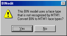 This message is rooted in the days when mtm1 still reigned supreme over the new up-and-coming mtm2. The message catered to the many mtm1 bin editors and reminded them that the new shiny face type is a no no in mtm1. If you do not want shiny faces on your model, click yes. This will work the same as setting the faces to normal mtm type. If, on the other hand, you do want shiny face types on your model, click no. This will open a windows box where you can enter the name and click save. Unless, your model has already been saved previously and you are just re-saving it again so you don't lose your work (which, by the way, is a very good idea to do often). In that case you will see the following prompt: