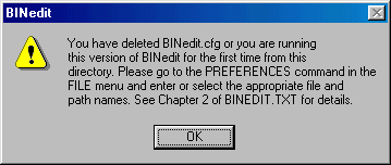 (Set up) Download one of the available versions of BinEdit here. Make a folder for the program. For example, C:\Program Files\Binedit. Note, however, that it can go anywhere on any drive. Unzip the binedit files to the folder you just made. Double click the BINeditSGI.exe or BINeditMS.exe (depending on which flavor you downloaded). You can also make a short cut to it from the main menu or desktop. This message will appear: