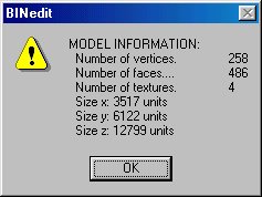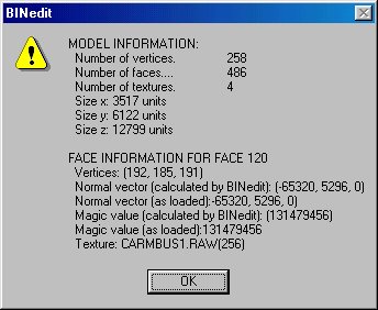 The extra face information can be helpful for advanced bin making. Knowing the verticies and textures of a face can be useful for further editing. The two Magic value numbers "as loaded" and "calculated by BINedit" are just that: the original value that was read from the BIN file and BINedit's attempt to recalculate the value. They can vary slightly, even if no part of the BIN has been changed - probably due to rounding errors.
