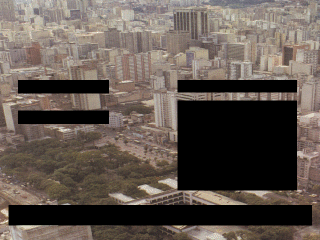 Note: This is a pretty simple tutorial, but was written assuming that you have experience with Paint Shop Pro. Ok, let's get started. These are the things that you'll need: 1. Paint Shop Pro or any other painting program Step 1 Open winpod then, press the "open" button and select the "UI.POD" file. Find and extract the files called "DRIVER.BMP" and "GOBTN.BMP" Step 2 Create or open a 640x480 image that you want to have as the new screen. I will use a picture of where I live for this example: ![]() Now, with PSP (or your favorite painting program) you must create five black filled rectagles in the following coordinates: