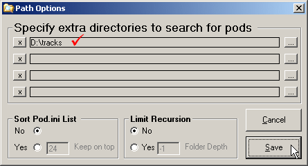 Before getting down to the nitty gritty, a word about pods in sub folders might be helpful. Some programs, like PodIt, will read pods in the game folder and it will also read pods in sub folders in the game folder. This is a very handy way to help organize your pod files. Cowpod will do this too. However, while Podit will read files in the next level of folders, Cowpod will read the files in all sub folders, no matter how far away from the game folder they are. For example, Podit will read pods in an "addon" folder.