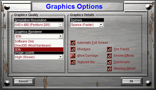 In case the game doesn't automatically switch to the 3Dfx wrapper then you have to do so manually. Simply start the game, go to Options>Graphics. From there in the "Graphics Renderer" box select 3Dfx and you're all set!