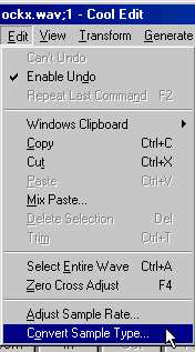 - Use a program like Cool Edit. Goto Edit>Convert Sample Type, and click the buttons for the settings you want. It's a little bit more complex but has far greater flexibility. Don't be intimidated by the techno jargon. (I used this for the music in Godzilla vs. Bigfoot).