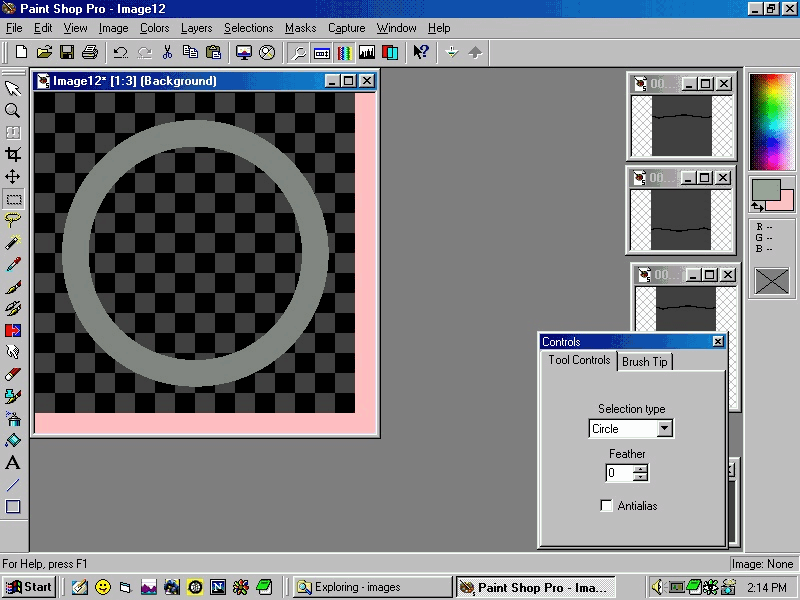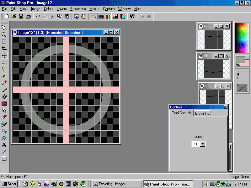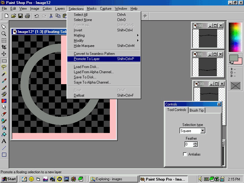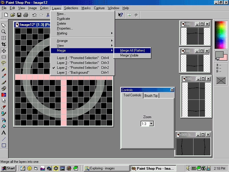 Repeat for the two lower portions of the image. Note. Sometimes when you try to select the next square you will get a message about "nothing to select." To fix this, after each promotion to layer touch the upper left part of the image so you see the word "background" appear beside the image name. You do not have to select the upper left area. You should look something like this.