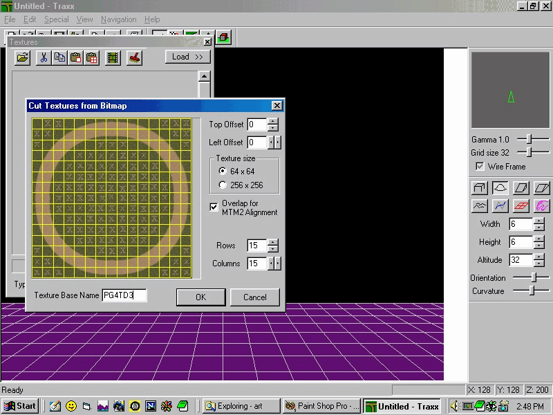 In Traxx 1.4, the final image will have to be 904x904 pixels. In order to get the extra four pixels you must swap the top/bottom two pixel edges and the left/right two pixel edges. This will make up 15x15 squares in the game. And, finally, always remember and never forget that the image must be an 8 bit 256 color graphic. You can find extra notes on the custom texture page in mtmg Traxx Help.