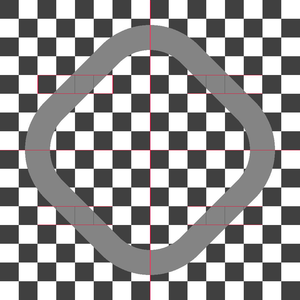 When using textures created using 45º templates, please keep in mind how they match up with the 90º set. The four textures highlighted with the square boxes are the straight road section of the 45º set. The point where the red line crosses the road at the top/bottom and left/right spots is where they will align with the straight roads from the 90º set.