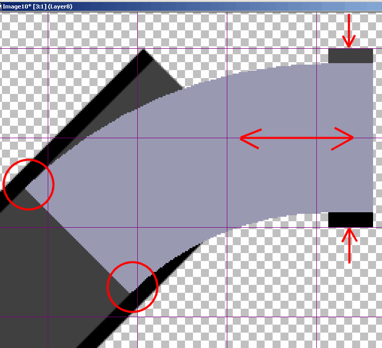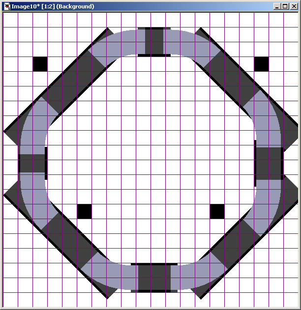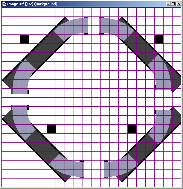 Important. Do not touch the graphic after you paste it on as a layer. Merge all layers and save using a new name. It should look something like this: ![]() The base roadRemember that? We need it again. ![]() Create a graphic the same height as your road (in this case 120 pixels) and about 600 pixels wide. Use the fill tool to fill the graphic with the base road image. Make a second copy. Rotate one of them forty-five degrees right and the other forty-five degrees left. Because each graphic begins as a perfect rectangle, the rotation gives a perfect forty-five degrees. However, aligning them with the corner sections will be the difficult part, so use the rectangle selection tool to outline one grid square and fill it with a color that contrasts with the background. For example: ![]() The master canvasWe need to create the forty-five degree template as a separate and distinct image. So, create a graphic approximately three times larger than the original, finished template. (eg, if the original template is 660x660, then make the forty-five degree template 1980x1980 pixels). Note. Keep using 60x60 proportions for ease of calculating. Paste the two forty-five degree road sections onto the master canvas two times each. Position them in a diamond shape in the upper left hand corner. Don't worry, you will have plenty of room to work, and you do not need to be perfect yet; an approximation is close enough for now. From the original, finished template we must now copy and paste each arc from each corner onto the master forty-five degree template. Important. You must include a part of the filler checker pattern with each arc to ensure proper alignment. Use the magic wand selection tool to highlight the road arcs. Notice the red lines restrict the selection to include just the arc. Hold the shift key to add part of the checker pattern. Like this: ![]() Copy the selection and paste as layer onto the master canvas. Then repeat for all eight arc sections. Move each arc into its approximate position over the forty-five degree roads. Make sure the arcs are above the roads. If they are not, you can use "bring to top" on the menu, or drag and drop the layers in the layer palette. You should now look something like this: ![]() Aligning the piecesFirst, make sure the squares we included with the forty-five degree road sections fit precisely within the grid view. This is crucial if road sections are going to line up regardless of the turn direction. ![]() Tip. Zoom in very close to ensure a proper fit. Next, fit the arcs so they first align with the grid view and then with the forty-five degree roads. The trick here is to always keep the checker portions we copied from the original template aligned with the grid view. Then just slide the arc along the grid view until the curved parts align with the forty-five degree road. ![]() Repeat for all eight arcs. Tip. For best results, make sure the upper two arcs are aligned on the same grid marks. Same goes for the bottom, left and right arcs. Opposing pairs (top-bottom, left-right) do not need to match each other (although you can do that if you want). The important thing here is that arcs on the same level match one another. Check listOn the forty-five degree roads, do all four guiding squares align with the grid view? On the arc sections, do all checker portions align with the grid view and do all arcs align with the forty-five degree roads? If you answer yes to both questions, then merge all layers. Crop overall canvasYou can now crop the image so it is a more reasonable size. Be careful to follow the grid view and keep the 60x60 proportions. ![]() Connecting the roadsPaste the base road as layers onto the master canvas several times and position the pieces to fill the gaps between the arc ends. Rotate the base road ninety degrees and paste as layers to close the gaps on the left and right portions. Note. This will not be a pefect fit. Don't worry if the base road overlaps itself. Just be sure the base road aligns with the grid view and with the arc ends. Note. When laying textures into your track be sure to include the full arc. The ends of some sections may resemble straights but they are not. Failing to recognize this quirk of the forty-five degree template has probably inhibited discovery of this easy method before now. ![]() Finishing touchesUse the magic wand selection tool (and the shift key) to select all road portions and fill them with a single color. Use Wint's checker base to fill the non-road areas. You should end up with something like this. ![]() SlicingObviously, the forty-five degree template is much larger than its ninety degree counterpart. However, when slicing, remember that most of it will be the base texture repeated across the entire surface. For a two-lane road such as demonstrated here, the number of textures generated should not exceed three hundred usable textures in total - for both templates combined. Note. It is possible to make a track using textures only from the forty-five degree template. In that case, you would just tighten up the texture arrangement to form a ninety degree corner that has a very minor straight part in it. Working this way, you could keep the texture count below two hundred in total. ConclusionsWhen you create the road textures, process the forty-five degree template in exactly the same way you process the ninety degree original. Doing so will provide seamless textures as well as forty-five degree roads that can branch off in all directions. ![]() Download the templates used in this tutorial here and here. |