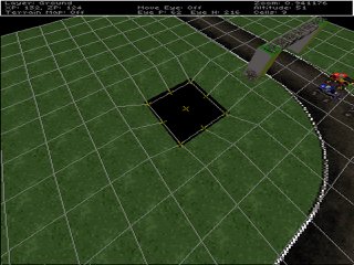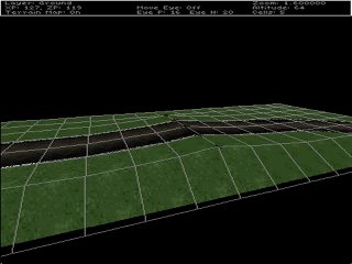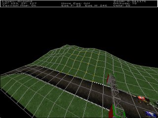 (Altitude Editor) Create a lake. At the moment, you can drive right across between the checkpoints, so lets put a lake in the middle to prevent that. To work with the terrain we need the Altitude Editor. From the track editor menu, select "C. Altitude Map Editor" by pressing the C key. You may also use the arrow keys to highlight "C. Altitude Map Editor" and press enter. ![]() You will see your track in the editor window. If you have not already done so, press the D key to turn the wireframe grid on. The grid is especially useful while editing terrain. The cursor should be a little + (plus) sign in the middle of the screen. Press the F6 key to resize it to 2x2 squares. You will see a + (plus) sign at each corner of each square. As you move over the terrain you will see the group of + plus signs move too - this is the terrain cursor and tells you what terrain will change when you edit. Point the cursor two grid squares away from the inside edge of the road and use the bracket [,] keys to lower the terrain. When the grass disappears you know you are below the water level (sometimes after a test drive you'll be able to see the water itself). ![]() Repeat this process all around the inside edge of the oval track - taking care not to undercut the location of the start-line banner post! The reason to keep the width/height small at this point is that its easier to be more accurate for these edges - especially on the corners. Make sure you dont cut too close to the road at the corners, also the road itself might be tilted. Mistakes are easy to correct with the bracket [,] keys, and the wireframe grid makes adjusting the terrain pretty simple. To flatten out the middle of the lake more quickly, adjust the terrain cursor size to fit the remaining parts and do it all at once. Add some jumps. Use F7 and F8 to adjust the terrain cursor to 5x1. Move the cursor over the track until its near the middle of a horizontal section of road and you can see how the yellow grid will add a jump to the track. Use the bracket [,] keys to increase the altitude 1 foot. Now move to the next square. Increase the altitude by 2 feet. Move to the next square and increase by 3 or 4 feet. To complete the jump, move to the next square and increase by a little less, maybe only 1 or 2 feet to form a downward slope. Try to form a curve or mound in the road for the jump. ![]() Note. The jump in the picture doesn't look very large, but in the game it will cause a fair size leap. To remind yourself, notice how small the trucks look at the start line. It only takes a little to get them air borne. You'll get a feel for it with a bit of practice. Add some hills. Use F6 to set the cursor to 5x5. With the terrain cursor aligned with the outside edge of one of the straights, use the bracket [,] keys to raise the terrain a little. The trick here is that the terrain is being raised as a block, not a hill. The way to deal with this is to raise a little, then move over a bit. Raise some more, then move over a bit more. Whenever you adjust the terrain, the "mound" is added to, or removed from, what's there already - you can use this to make a longer gradually raised section, for example, by stepping the terrain up in many rows, or make a steeper jump by raising the ground sharply in the same place. Repeat this process until you've added some hills. ![]() You can use this technique to build-up mountainous terrain. If you prefer wider, smoother hills just set the terrain cursor wider and larger. Manual editing. You may end up with a very spiky range of hills, but thats ok - reduce the terrain cursor to a single point and move over the hills we just added adjusting the altitude at the same time, using the bracket [,] keys on the spikes and hollows, until its reasonably smooth. This technique is excellent for fine tuning. Experiment. Try different size areas and adjust the terrain sharply or gently to see the effect you'll get - you are limited only by your imagination :) But dont go crazy - hills that are too steep, or roads that are too bumpy etc can make a track too difficult to enjoy racing on... Leave at least one part of the road-side flat - we'll need it for later... Remember, when in doubt, it only takes a few seconds to save your work and test drive any changes you make in the game.
