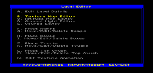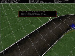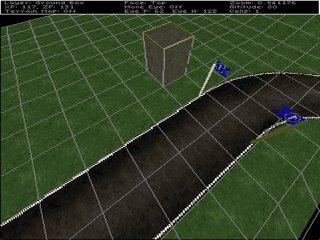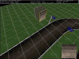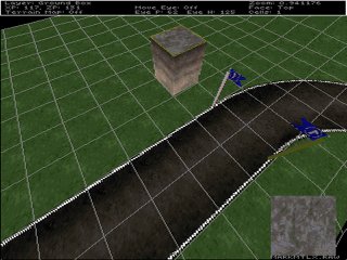 (Altitude & Texture Editor) There are two layers to our world: the "Ground layer" and the "Ground Box layer." The Ground layer is the normal terrain that you drive over and the Ground Box layer is used for special terrain such as bridges, tunnels, or buildings. To work with the ground boxes we again need the Altitude Editor. We will use them to build a wall. From the track editor menu, select "C. Altitude Map Editor" by pressing the C key. You may also use the arrow keys to highlight "C. Altitude Map Editor" and press enter. ![]() You will see your track in the editor window. Press the tab key until you see "Ground Box" in the layer section of the information bar. The cursor will change from a + (plus) sign to a square (like the texture editor). ![]() Ground boxes are solid block objects in fixed locations, aligned to the terrain grid squares. Locate the cursor alongside part of the track and press the B key. You will be prompted to enter a top altitude for the box. Type 80 and press enter. You will be prompted for a bottom. Type 1 foot below the terrain surface (see the altitude in the information bar; in our case we'll use 59) and press enter. ![]() A cuboid will appear. ![]() Press the F key to toggle between the top and bottom surface. You can also use the bracket [,] keys to raise and lower ground boxes, just like in terrain editing. Save your work. Paint the groundbox. Textures can be applied to ground boxes just as they can be applied to the terrain. From the track editor menu, select the Texture Map Editor. ![]() Press the T key to open the texture browser, then the G key for the goto texture box. Type "C8BR" to jump to that texture group and select C8BR100.RAW. Back in the texture editor, press the tab key until you're in the Ground Box layer, just as you did in the Altitude editor. Now press the F key to cycle through the faces on the ground box. When the cursor highlights a side, press the space bar to apply the texture. Repeat this for the other three sides. ![]() Once again press T to open the texture browser, and G for the goto box. Type "MARK" and select the MARKMTLX.RAW. Now use the F key to cycle through the ground box faces. When the top is highlighted, press the space bar to apply the top texture. Do this again to paint the bottom of the ground box using the MARKMTLX.RAW texture. ![]() Note. If you want to see the bottom of the ground box, press the E key to rotate the camera eye so that it's below the terrain surface. This may seem pointless, because you'll never see the bottom, but it is necessary for the underside of bridges etc.... so you might as well start good habits now. Save your work. Build a wall. The wall will be made by adding copies of the groundbox we just created. From the track editor menu, goto "C. Altitude Map Editor" once again. Use the tab key to goto ground box layer (if it isn't already). Place the cursor on top of the ground box. Now press F9. Move the cursor so the square next to the ground box is outlined, then press F10. Paste again as many times as you want to build a wall. Unfortunately, the textures are not copied at the same time. But this is no big deal. Just place as many ground boxes as you need, then go back to the texture editor. Select MARKMTLX.RAW from the texture browser and paint the top and bottom of all the boxes. Now do the sides using C8BR100.RAW. Quick and easy. ![]() Note. One good consequence of switching between texture and altitude editors is that you save your work often.