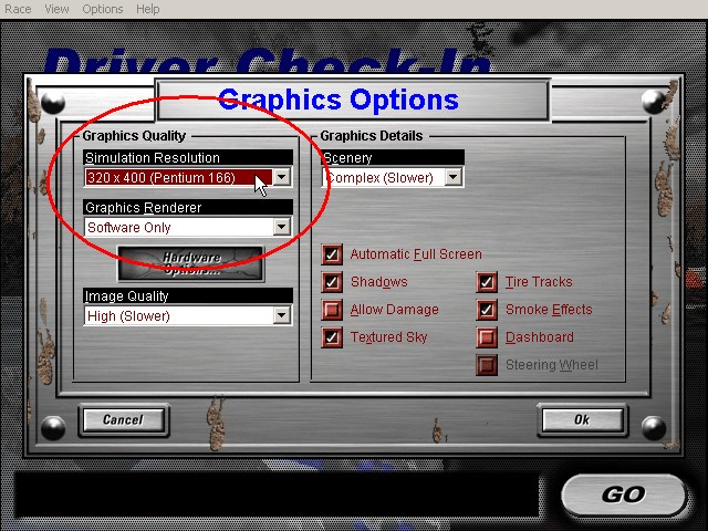 To use Tracked2 with Windows XP, start the mtm2 game and, on the menu, goto Options > Graphics