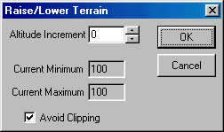 The current minimum and maximum values show you the lowest and highest points in your track. This will help you know just how much you can raise and lower the terrain. Set the "Altitude Increment" to the amount (positive=up; negative=down) you want to change your track. It is a good idea to leave the "avoid clipping" box checked so that you don't get flattened mountain tops or valley basins in your track. Click OK and the entire grid area will rise or sink by the amount you have indicated.