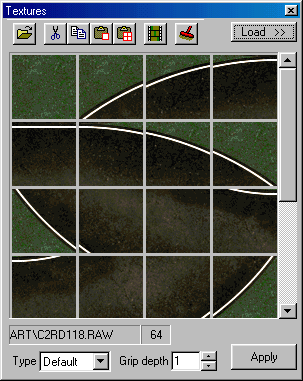 (Arranging) This section might better be titled, "Placing and moving textures all around the terrain so that your track actually looks like a track," but it wouldn't fit on the menu so I settled for "Arranging." Also, the Guild highly recommends that you follow the lessons outlined in Traxx School which provides detailed coverage on this topic (among others) within its own context. If you have not done Traxx School, then I would suggest you might want to do that now since I have no wish of trying to re-write or improve upon Traxx School or otherwise belabor a point unnecessarily. Instead, this page, for the sake of reference, will briefly review the basics of applying textures to the terrain, and then move on to a few definitive issues. Assuming that you have loaded all the textures that you want to use, you may close the right side of the textures box by clicking the load button.