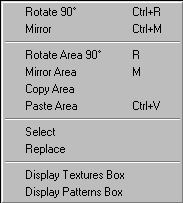 Note: this is not the same as rotating ninety degrees. The texture appears upside down, but has not been reversed. Use this feature to create varied effects in your track. Rotate Area 90 degrees. This feature works exactly the same as the plain "Rotate 90 degrees" feature, except that the rotation can affect a much larger area. Instead of being limited to a single texture, you can rotate an area up to 16x16 grid squares. This is another time saving feature that will help make short work of painting the terrain. Mirror Area. This feature too works exactly the same as the plain "Mirror" feature. Just as with Rotate Area, Mirror Area can affect an area up to 16x16 grid squares. Copy Area. This feature allows you to copy texture sections from one area of your track to be pasted into another. The copied area is NOT stored in the windows clipboard. Paste Area. Used with the copy feature, this will paste texture areas to different locations in the terrain.
