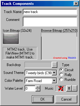 Browse Bitmap - This is the picture that accompanies your track in the MTM2 races screen. You may use a screen shot from your track or a graphic drawing that you make. For a proper fit, it should be a 257x210 pixel graphic and it MUST be a 256 color bitmap. After your picture is made, right click the browse bitmap in the track component box and select load. ![]() Browse to your graphic file and click open. You will see your new picture in the place of the gray Traxx default pic.