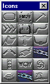 To access the track component box, either click the component button ![]() Either of these methods will bring up the following box: ![]() Track Name - Type in the name of your track as you want it to appear in the game. You should keep the name down to about 20 - 25 characters. Anything over that amount will usually not be seen. Comment - Type in any information that you want associated with your track. This will not appear in MTM2. You might, however, want to use this space to make reminder notes to yourself, or to include an e-mail address or web site address should somebody decide to have a closer look at the contents of your track. For instance, using WinPod. Icon Bitmap - This is the little button that appears to the left of your track name in the MTM2 races screen. You can use the default button that you see here or you can make one of your own. It MUST be a 32x24 pixel 256 color bitmap. You may also select one from a collection of stock buttons. To do this, right click the button and select "stock' from the pop up menu. ![]() This will bring up the following window. ![]() Click on the stock icon that you want to use, and it will appear in your track.