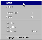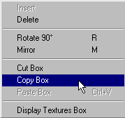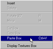 All faces will be colored with the same texture if a texture is active (in the textures box - the same one you use for ground textures). For more details on painting ground box faces please see here. Also, the ground box will have its top and bottom face located at the default altitudes, or at the altitudes of the last box you added/edited. For more details on sizing ground boxes please see here. Copy and Paste Inserting, painting and sizing one ground box can take a lot of work and be very time consuming. But, if you plan to create something that will use the same ground box altitudes and paint - for example on a roof of a building or tunnel, or for a bridge - you can save a lot of work by setting one ground box the way you want it and then just copying and pasting it again and again. To do this, select the ground box you want to copy by right clicking on it with the mouse and choose copy from the pop up menu. Next, move the mouse to the grid square where you want the next ground box to appear. Right click and select paste from the pop up menu.