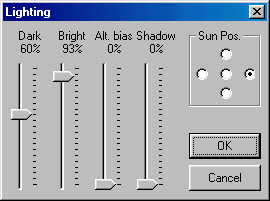 (Lighting) Lighting effects are little known and often over-looked settings that you can use to enhance the way your track looks. Use these settings to position the sun, lighten and darken shadows, and adjust the overall "ambiance" or environment lighting of the track. Access the lighting feature by selecting Special / Lighting from the main menu. ![]() This will bring up the lighting box with the following default values: ![]() The Sun Pos(ition) is the setting I've used most. Use the radio button to position the sun north, south, east, or west. For my arena tracks I positioned the sun directly over head (shadows didn't look very good otherwise). On another track I positioned it so that it would glare the windshield while the driver was going down a long straight-a-way. A lot of times, the sun position might not make a big difference, but it is still a nice flexible feature that gives you more control over the way the track looks and works. I have not used the other settings very much, so I will let Guitar Bill remind us what they are all about. Dark and Bright - sliders determine the diffuse brightness of the terrain based on their orientation toward the sun. The side of a hill, for instance, that is at 45° and facing the sun location, will have its brightness set to the Bright value. Similarly for a flat area with the sun directly overhead. Terrain that is facing away from the sun location will be set to the Dark value. These two parameters therefore provide the initial "ambient" lighting. Typically these look good set somewhere around 50% and 97% respectively. You can set these to the same value if you want the whole terrain to be lit at the same brightness. Alt. Bias - modifies the brightness of terrain based on altitude - adding additional "darkness" depending on how far below the terrain's maximum point you go. With this set to 100%, any terrain 255 altitude units below the highest peak will be black. Typically a value of 30% - 50% works well. This allows you to darken valleys, etc. Increasing the Alt. Bias value will increase the amount of "darkness" that is added. High altitude points (mountain tops etc.) are affected very little by this setting. Shadow - intensity determines how much darker to make areas which are in the shade of either overhanging ground boxes (bridges, tunnels etc.), and/or terrain features (cliffs, mountains etc.). If the sun is directly overhead, shadows will only come from ground boxes, otherwise the shadows are calculated based on sun rays coming in at approximately 45°. Obstructions that are more that 16 grid units away will not cast a shadow. Increasing the Shadow value will increase the "darkness" of the shadows. (Traxx Help). Be creative!