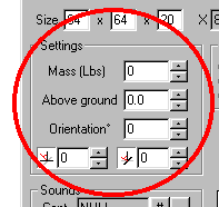 (Settings) The settings options are located at the middle-left of the object properties box. Settings are divided into three types : Mass (Lbs) weight, Above ground, and Orientation (which also can be divided into three sub-types : rotation and two tilt settings). All settings are adjusted by entering a number in the value box, or by using the scroll wheels to roll the values higher or lower. All values default to zero.