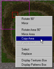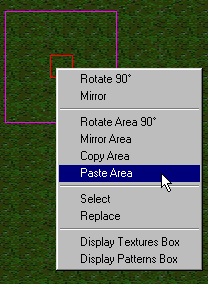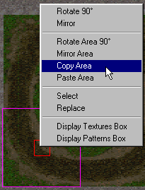 You will have to adjust the size of the "paint mode" area to fit the size of the sections you are copying and pasting. For example, straights, corners, and other ground accouterment. You will probably have to re-save the location using the Menu/Navigation/Save Location or F2 to make your return more exact as you add to your track. After a significant amount of track has been put in place, you can actually use your track as a template too. That is, you can copy and paste areas from nearby sections of your track instead of going back and forth between the template and your track. Rotate Area 90 degrees & Mirror Area These features work exactly the same as they do for a single texture, except that you can now rotate and mirror areas up to 16x16 grid squares in size. See Arranging Textures for details on single texture rotate and mirror.. The only note worthy exception that I can think of is that you might want to make sure you are working with "square" areas when you use the "rotate" feature. For example, a paint mode area of 5x5 or 3x3 is preferable to 5x3 or 2x4.