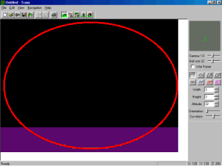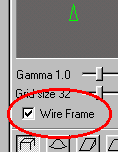 This "area" is the world of your track. The black region that you see when you first start Traxx can be considered the "sky" and the purple area is the "ground" upon which you will build your track. For the moment, we will not concern ourselves with the sky area, and we'll direct our attention to the ground (purple). The ground in Traxx is divided up into a series of vertical lines and horizontal lines that cross one another. The easiest way to understand this is to just look at it. So, on the control bar, place a check mark in the box labeled "wire frame" like so: