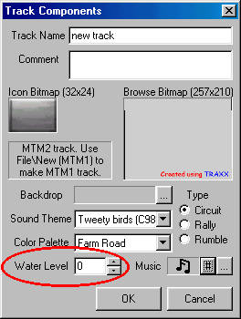 The only real concern you have when you set the water level value is to make sure that it is not set higher than the lowest roads in your track, excepting, of course, that some tracks deliberately dip the lowest roads into the water for the sake of effect.