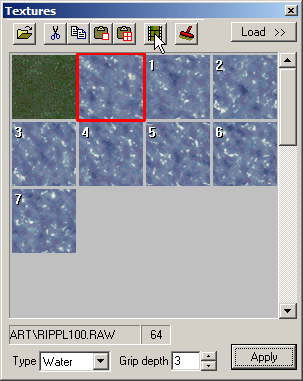 1. You can use Water Textures for your road and set the texture properties to water with an appropriate grip depth. If you animate the textures it can look acceptable. The good. This method is the least restrictive. Your road can travel over any altitude changes you want to give it. And, you can use the water textures in the startup.pod (RIPPL100.RAW to RIPPL800.RAW). You can also create your own (Salmon Run by mike204) or use the mtm1 water textures (Motor Boat Madness by 2Xtreme). The bad. Using a water texture gives the road a sharp-edged, artificial look. You might be able to compensate for this by using something like winterkill's templates, but if you animate the water you may find you have problems aligning the textures so they appear seamless. A second drawback is that the trucks lose a bit of tire grip. Note. This same technique is used to create flowing rivers, streams or water falls - such as you'll find in Proving Grounds by Sir James, SRT Mountain by World and Snowbound by Skyman.2. You can insert Ground Boxes above or below the road area, and the water will take on the properties of the ground box textures. That is, the water will inherit the texture properties of the ground boxes. For example, when a ground box texture is set to concrete and you drive through water underneath the ground box, the water will act like concrete rather than the usual water resistence. To see this above and below idea in action, download this Water Test Track (57k). The good. This method uses the game's real water. There is no attempt at artificial simulation of water because it's the real thing. The depth of the water is controled first by the water level itself, then by the terrain (lower means deeper water, higher means shallower). The bad. Straying away from the ground boxes causes the water to behave normally. So, you must make sure you cover every area in which you want the trucks to travel fast. Also, ground boxes above the water can look ugly. You can compensate for this by placing them beneath the road. However, when you travel under a ground box, you see the trailing water effects but when the ground box is below you no longer see this. Lastly, although the game permits thousands of ground boxes, the more you use the more lag you can get in the track (as well as glow-in-the-dark backdrops and have 'mark increase box count' errors).