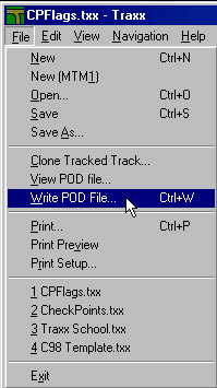 (Writing the Pod) This is the last step to finishing your track. When working with Traxx we save our work and the file has a TXX file extension. This is recognized by Traxx only. In order for MTM2 to run your track you must create a pod file; a special file with a POD file extension.