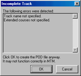 If everything in your track is complete, a windows box will come up. Browse to the MTM2 folder, give your pod file a name, and click save. Traxx will write the pod file for the game. If something is not complete in your track, you will be reminded about what is still undone. For example, the following graphic shows that the track still needs to be named and have the extended courses set.