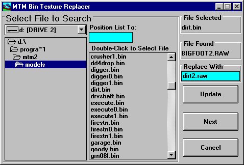 (Mdmre's Bin Texture Replacer) You've already done the mdmre repaint (327k), right? Then you should already know all about this stuff. Either way, please let this page serve as a reference for Burn's Hex Editing instructions on the next page. In order for your renamed stock truck bin to display your newly painted textures, you'll need to make sure the bin reads the correct textures. To do this, please follow these notes: Start MTM Bin Texture Replacer, select YurTruck.bin and press SEARCH. The first file found will be Bigfoot1.raw (for example), enter YurTruk1.raw in the "replace with" box and press UPDATE. Do this with each file found that needs replacing, using the matching YurTruk?.raw file. Keep pressing NEXT until you see a window that says "File Saved"