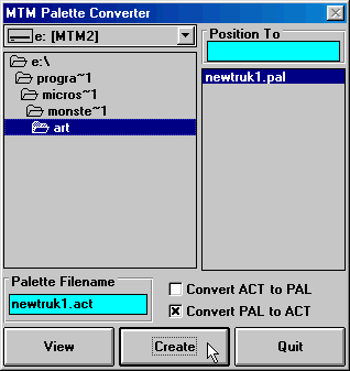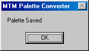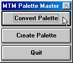 Now you can load the texture and it's new PAL file into Paint Shop Pro. You are ready to work with your texture. For a few notes on how to load textures into PSP, please click here. Okay, once your texture is the way you want, and you've saved in RAW format and created a PAL file for it, you have to reverse the above steps to convert the PAL file back into an ACT file. Double click mtmpmstr.exe. Again, the option box appears.