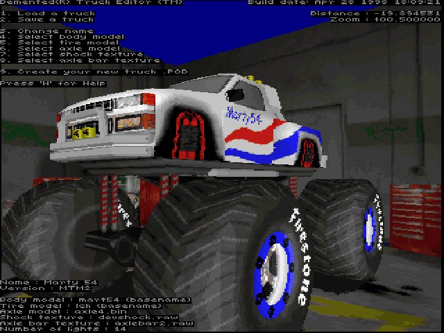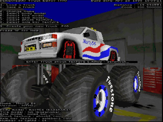 The shock texture is a 64x64 raw (and act) file. When you're ready, press "7" on the keyboard. You will be prompted for the texture name. Type it and press enter. If the raw and act file is in the art folder, the new shocks will appear on your truck. Of course, the information in the bottom left corner of the screen will be updated to show your new shocks. Now you can continue to work on your truck. |